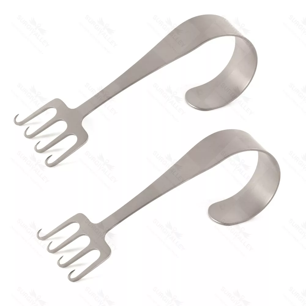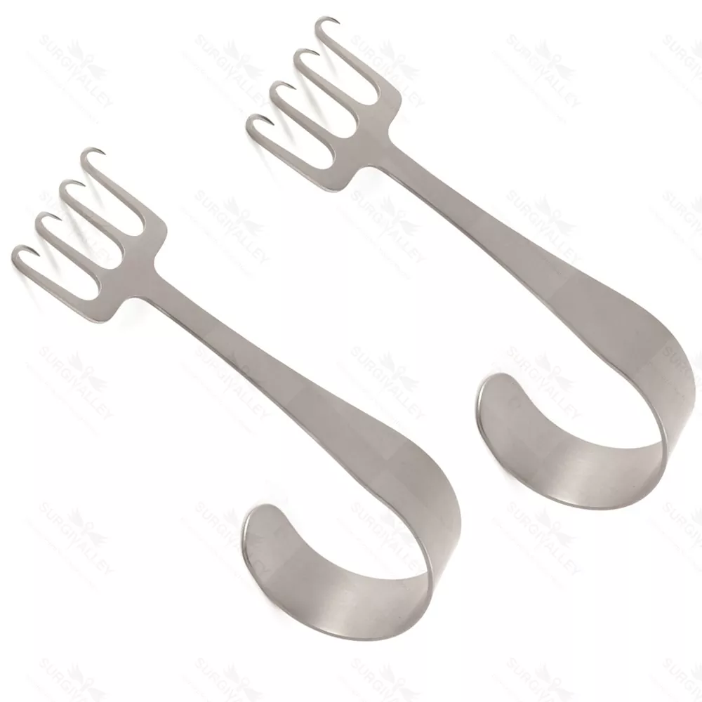 Este set de retractores faciales Freeman con gancho inverso de 4 puntas está diseñado para procedimientos de lifting facial, proporcionando una retracción segura y constante de los tejidos. Su configuración permite una exposición óptima del campo quirúrgico, esencial para la precisión en cirugía plástica.